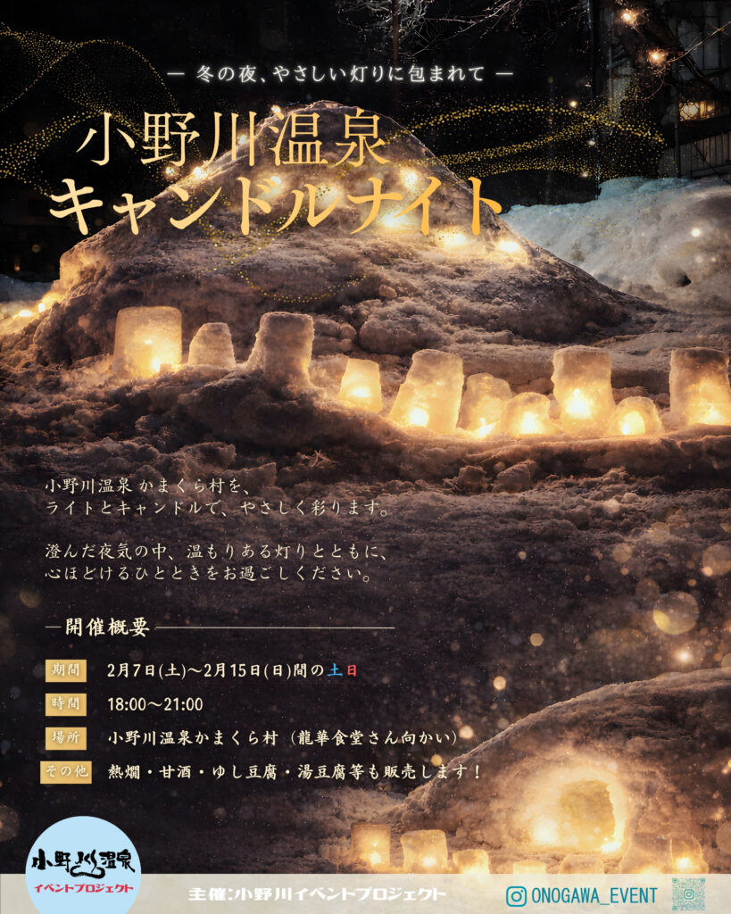 小野川温泉かまくら村(龍華食堂向かい)にて、4日間限定でキャンドルナイトが開催されます。
